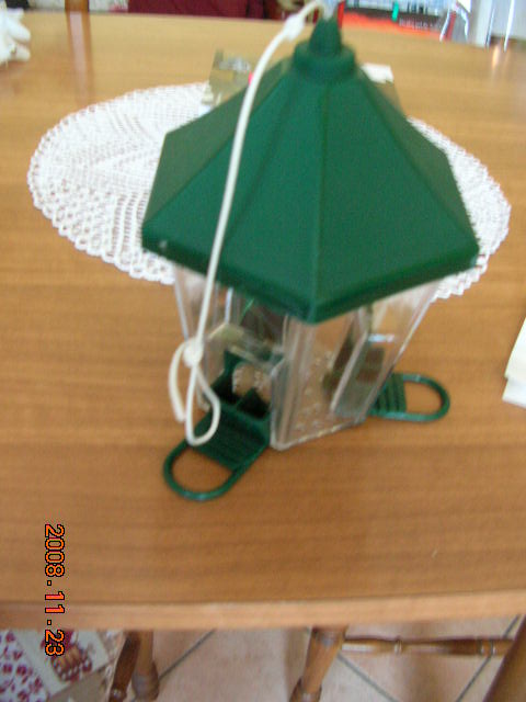 先日、写真のような給餌器を購入、さっそく台所前の大きな木の枝に取り付けました。