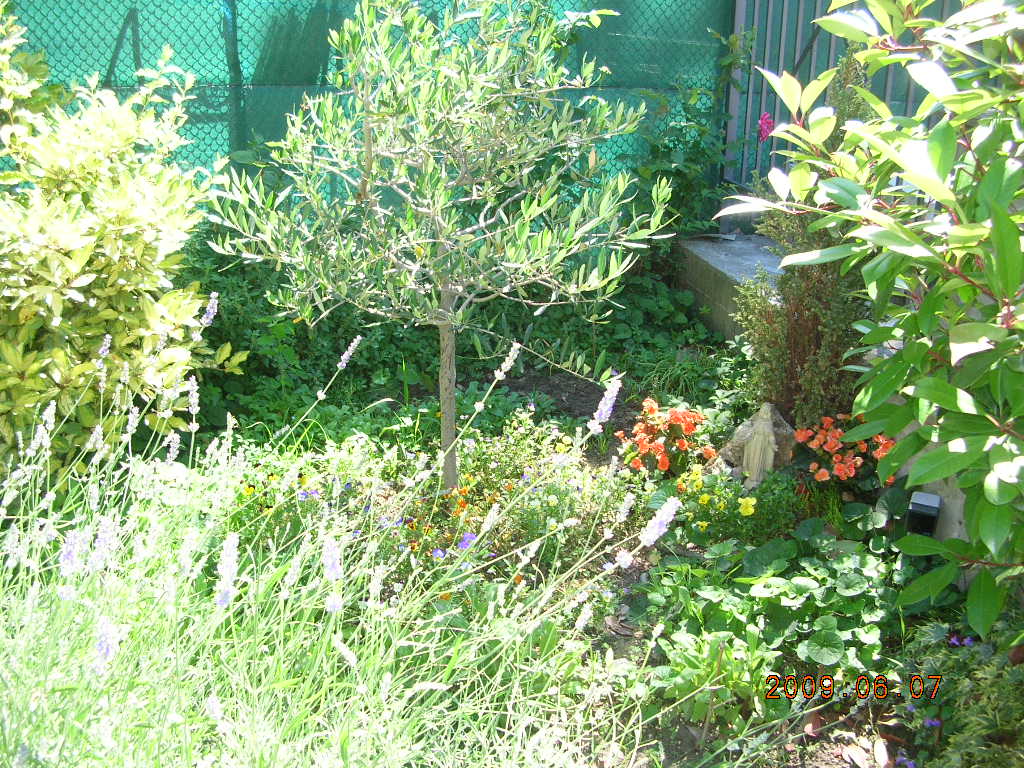 中央は剪定して小さくなった大鉢のオリーブを植えたもの。
